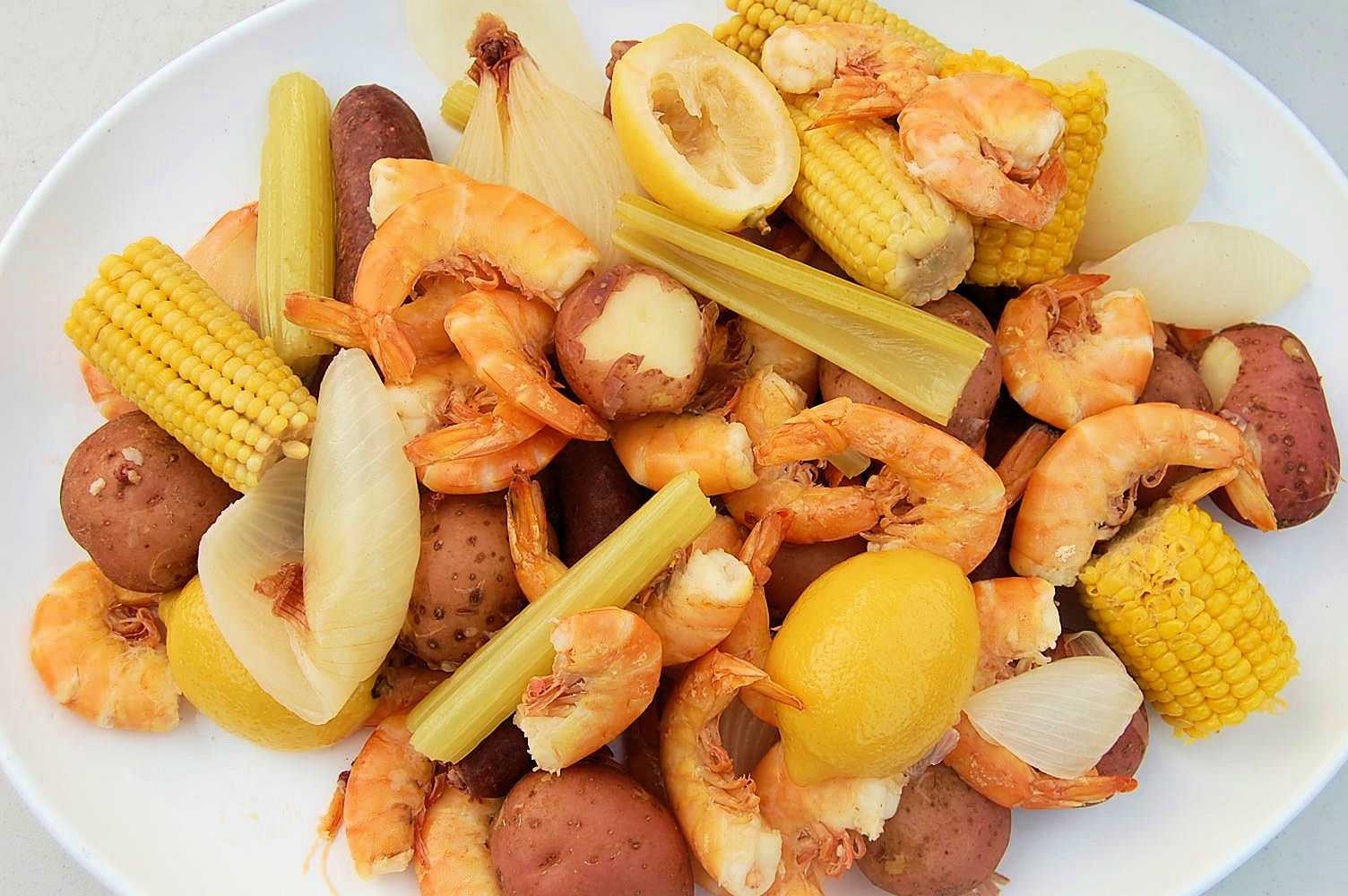 Summer Shrimp BoilIngredients:5 lbs (21-25 count) shrimp2 1/2 gallons of water2 large onions, quartered2 heads of garlic6 stalks of celery, cut into thirds4 lemons, halved6 bay leaves1 bottle of ZARTRAIN's or Old Bay Seasoning for boils or steamers1 lb smoked sausage, cut into 4" links1/2 cup salt ( I know this seems like a lot but trust me!)2 tsp cayenne pepper2 lbs red new potatoes6 ears corn, broken in thirds1/2 bag of ice Directions: In a heavy 20-quart stockpot, with it's steamer insert, bring water to a rolling boil. Drop in all ingredients but the potatoes, corn and shrimp Cover and rapidly boil at least 10 minutes to create a flavored seasoning stock. Add potatoes, return to a boil and cook for another 5 minutes. Now add the corn and boil for another 10 minutes. Add shrimp the the pot, cover and return to a boil. Boil for 2-3 minutes tops. Immediately remove pot from the heat and add ice. Let the shrimp, sausage and vegetables soak in the water for 15-30 minutes. The longer they soak the more flavor they absorb. Drain off water before serving and pile onto plates. There is no need to silverware, this is to be eaten with your hands. Provide plenty of napkins, you and your guest will surely need them. Enjoy!