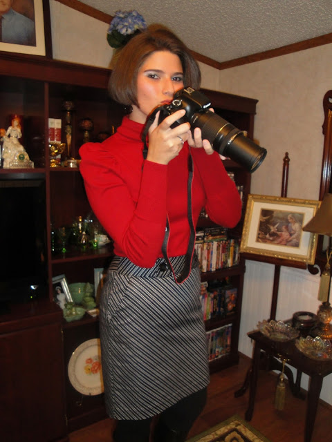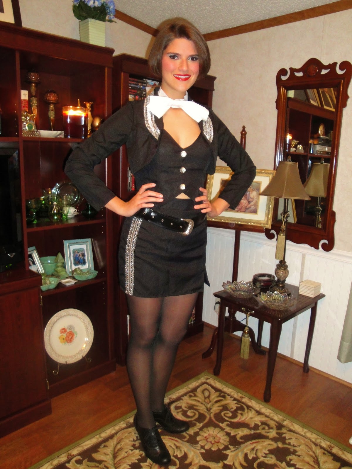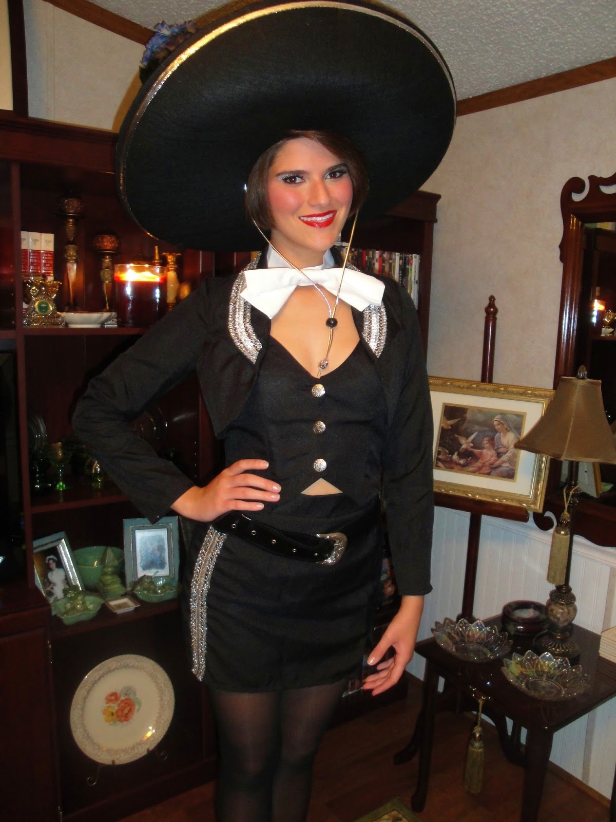 This evening, I am paying homage to my Mexican ancestry. I will dress an a member of a Mariachi Band. The musician's traditional attire is called a "traje" which means a suit and consist of a wide-brimmed hat called a "sombrero", a jacket called a "chaleco" or a "bolero", and tight-fitting trousers with shiny buttons on the sides. Of course there is a large bow tie, because it is formal attire. I will replace the tight-fitting trousers with a tight-fitting skirt, with a slight slit on the front side.