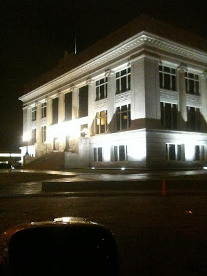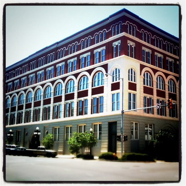1917-The oddly-shaped intersection at Sixth and Eighth streets is the home of the Miazza-Woods "Flatiron" Building. The vee-shaped structure was patterned after the Flatiron Building on 23rd Street in New York City, where girl watchers gathered and waited for the unusual winds around the building to tug at skirts. Police walking the beat would warn them to "23-Skidoo" from the area. Behind the Flatiron Building to the left are Threefoot Brothers Wholesale and the Saenger Movie Theatre.